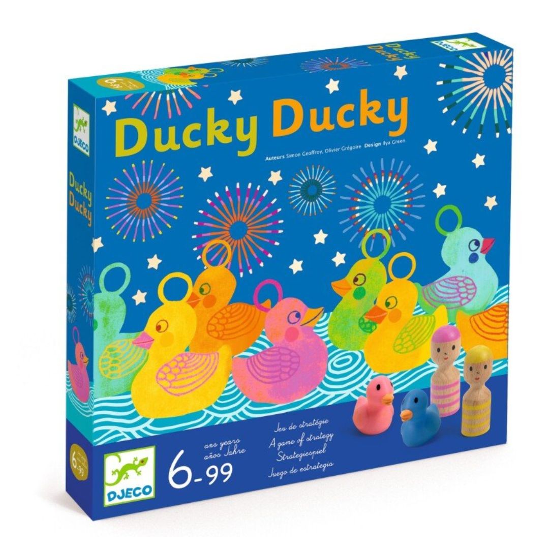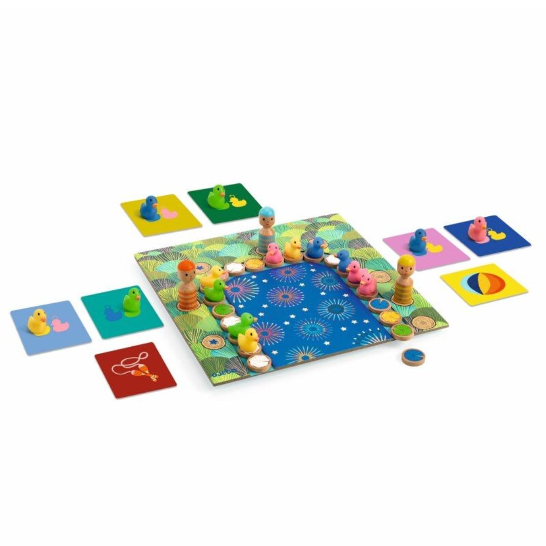 - Material: cardboard with wooden and plastic figures. The set includes 1 board, 21 water lily tokens, 24 gift cards, 16 plastic ducks, and 4 wooden pegdolls.