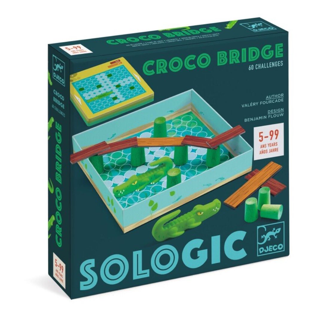 - The set contains 1 game board, 2 crocodiles, 10 logs, 7 boards (5 small and 2 large), and 30 double-sided challenge cards (3 difficulty levels)