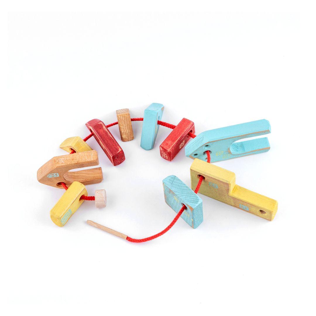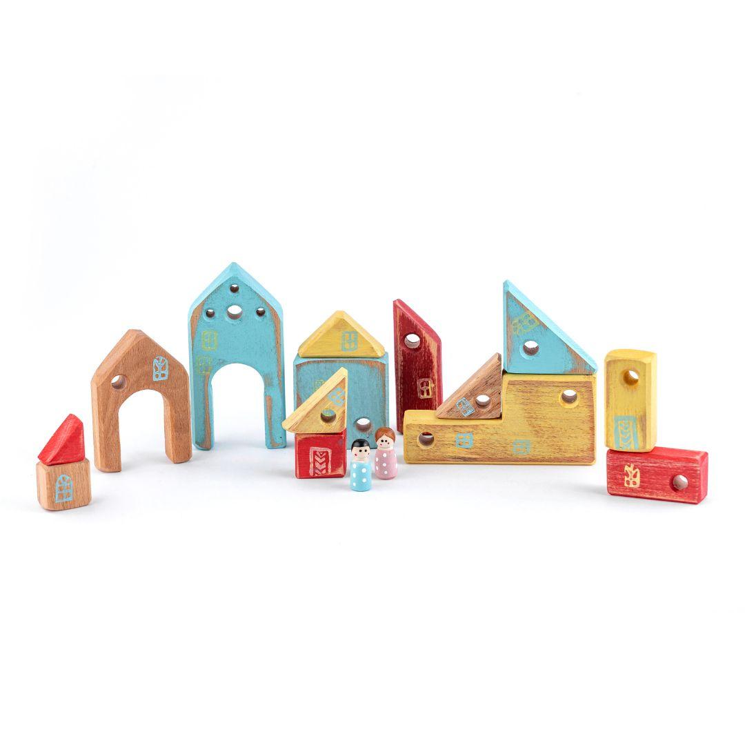 - Contains: 14 wooden blocks in different shapes and colours, and comes with a string and two figurines.