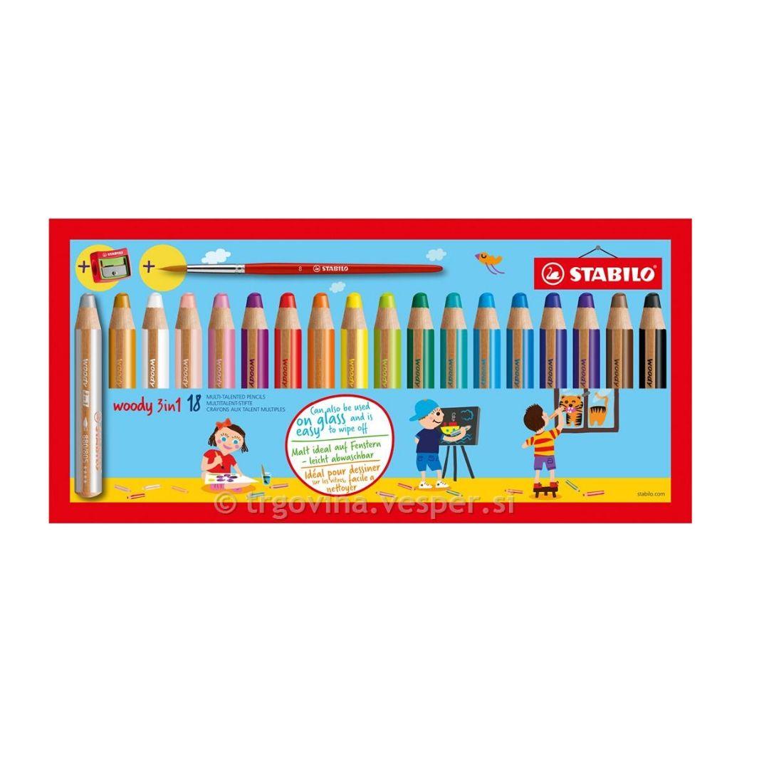 - Komplet vsebuje 18 barvnih svinčnikov, šilček in čopič