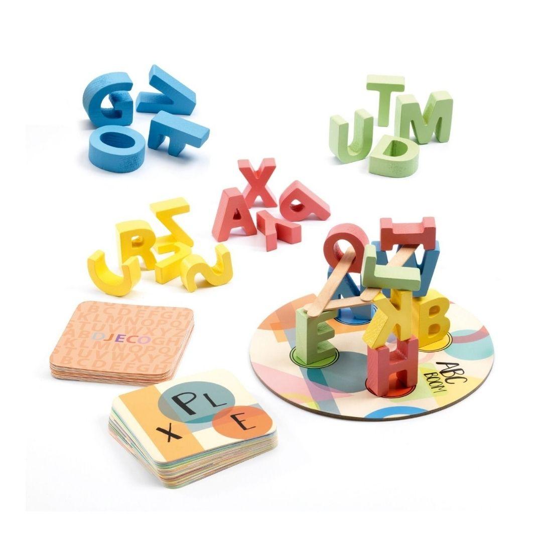 - Material: karton in les. Vsebuje: 1 tabla, 42 kart, 26 lesenih črk, 14 palčk