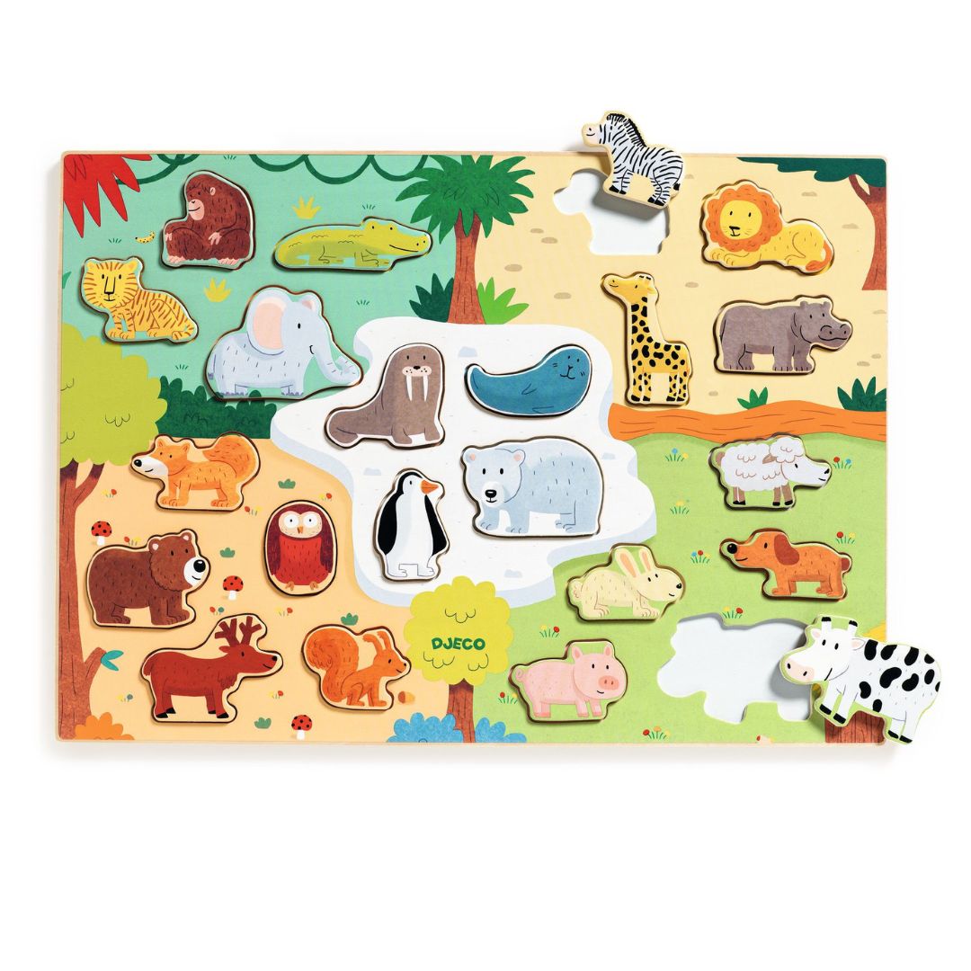 - Set vsebuje leseno podlago in 22 kosov različnih živali.