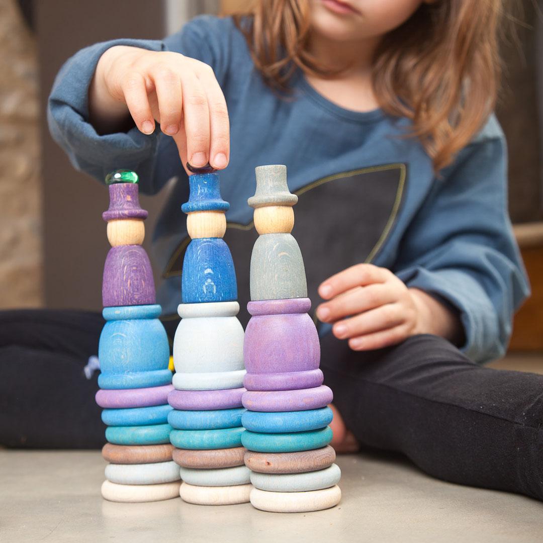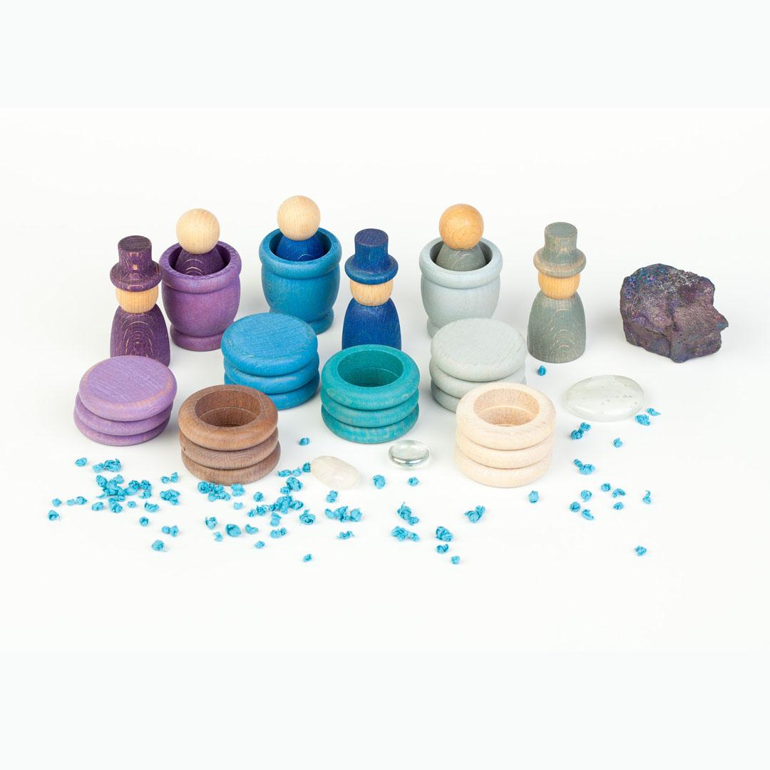 - Komplet vsebuje 3 figure, 3 figure s klobukom, 3 lončke, 9 obročkov in 9 ploščic v usklajenih, zimsko navdihnjenih barvah.