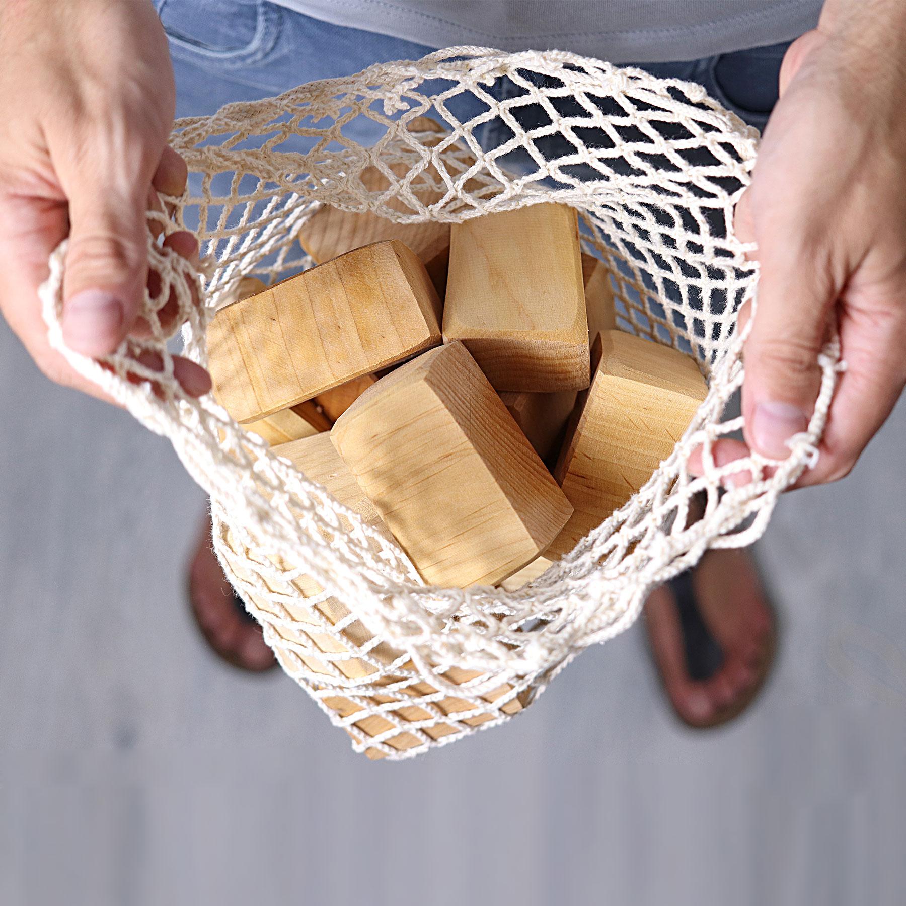 - Mere: dolžina vsake kocke je približno 6-8 cm. Komplet vsebuje 15 kock nekonvencionalnih oblik, ki so shranjene v mrežasti vreči iz blaga. Oblike in velikosti kock se lahko razlikujejo.