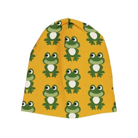 Zakaj ne bi otroški garderobi dodali kanček barve in trajnosti s to kapo iz organskega bombaža in vzorcem poskočne žabe?