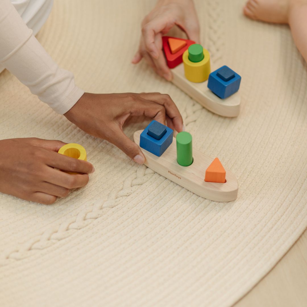 - Set vsebuje: 1 osnovo s 3 odprtinami, 3 polne oblike (trikotnik, valj, kocka) in 3 votle oblike (trikotnik, valj, kvadrat).