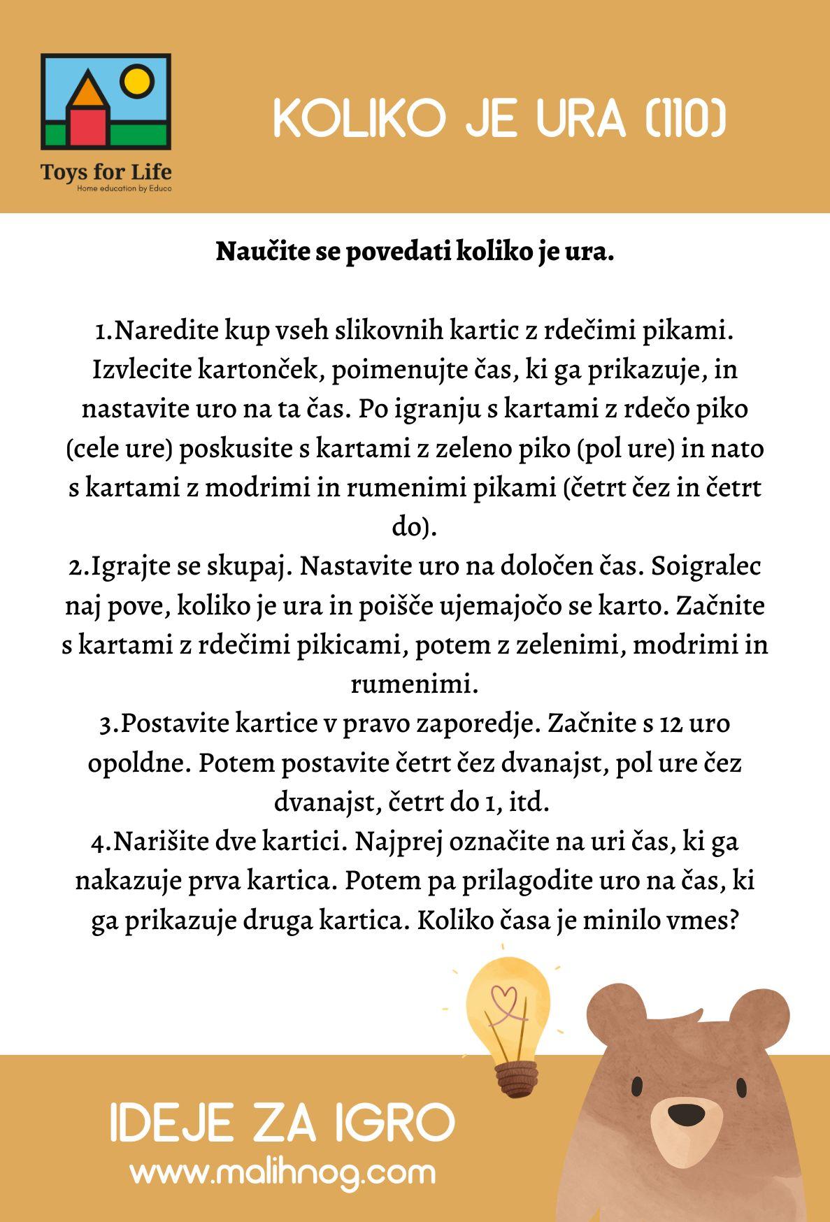 - Vključuje leseno uro (D cca. 14 cm) in 48 kartic (6 x 6 cm). Pride v magnetni škatli (23 x 21 x 6 cm).