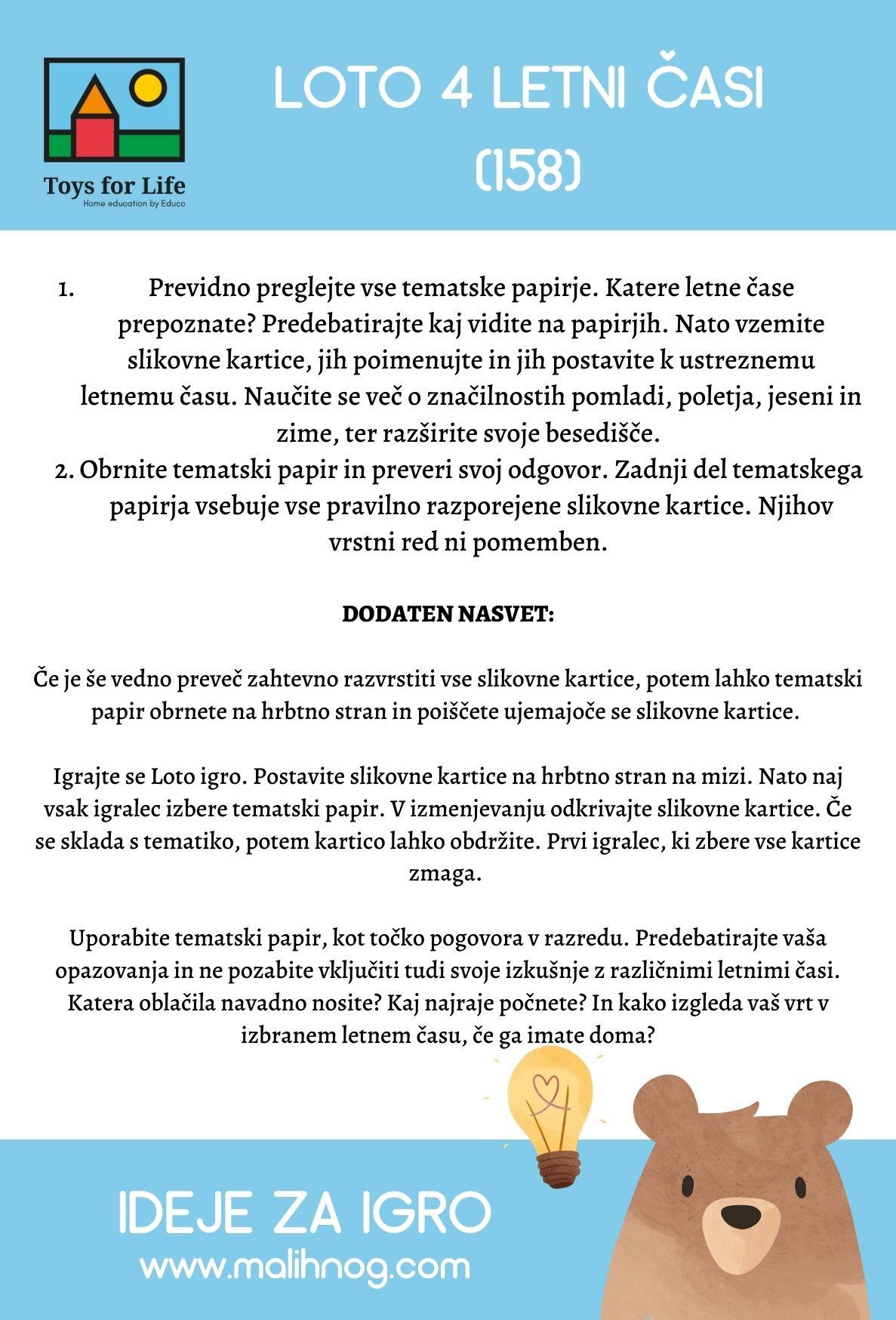 - Vključuje 4 lesenih tematskih papirjev, 24 lesenih slikovnih kartic. Pride v magnetni škatli (21 x 12 x 6 cm).