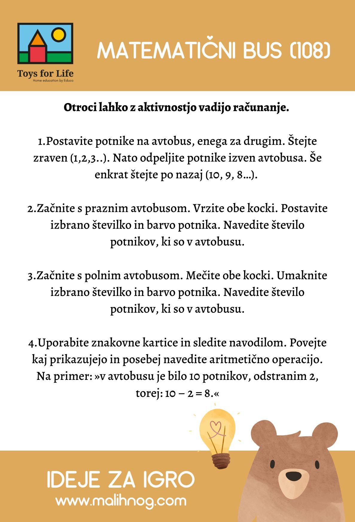 - Vključuje lesen bus (18 x 10 x 7 cm), 5 rdečih in 5 belih lesenih potnikov, 22 kartic z nalogami (7,5 x 5 cm) in 3 lesene kocke (2,5 cm). Pride v magnetni škatli (21 x 12 x 9,5 cm).