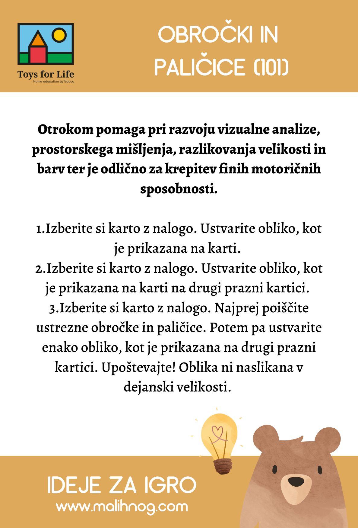 - Vsebuje: 6 lesenih kartic z 11 nalogami (21 x 15 cm), 100 plastičnih oblik v 4 barvah.
