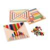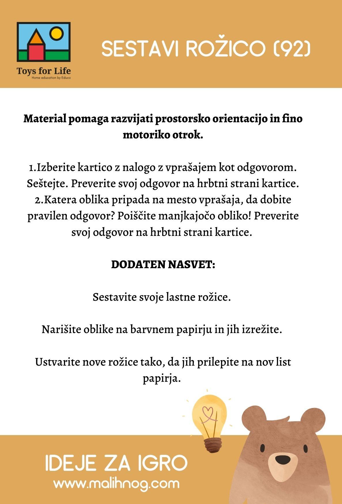 - Vsebuje leseno stojalo (29 x 9 x 0,6 cm), 8 lesenih kartic z nalogami (23,5 x 4 cm), 14 lesenih oblik v različnih barvah