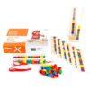 - Vključuje prozorna plastična kvadratna podlaga (20 x 20 cm), 3 lesene obojestranske tablice z 6 nalogami (19 x 19 cm), 400 plastičnh perlic v 9 barvah.