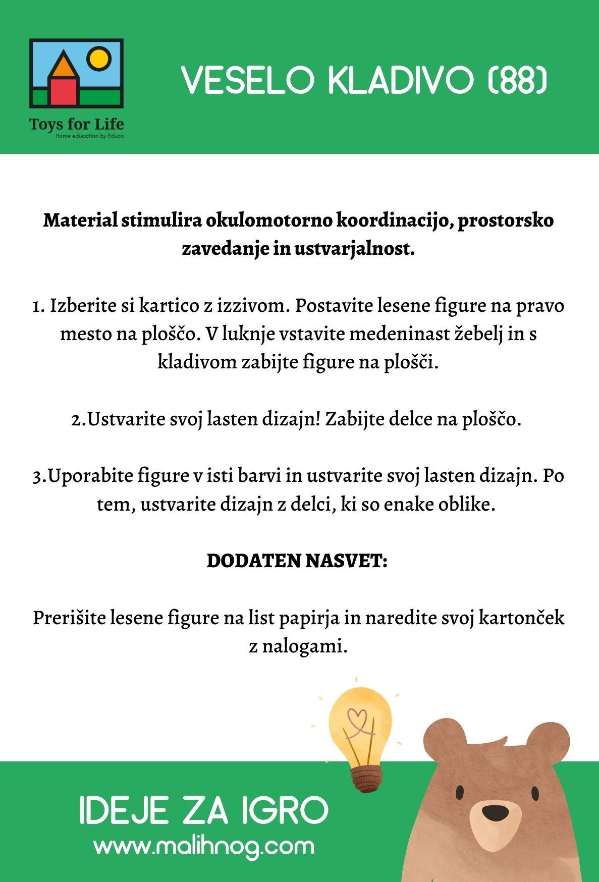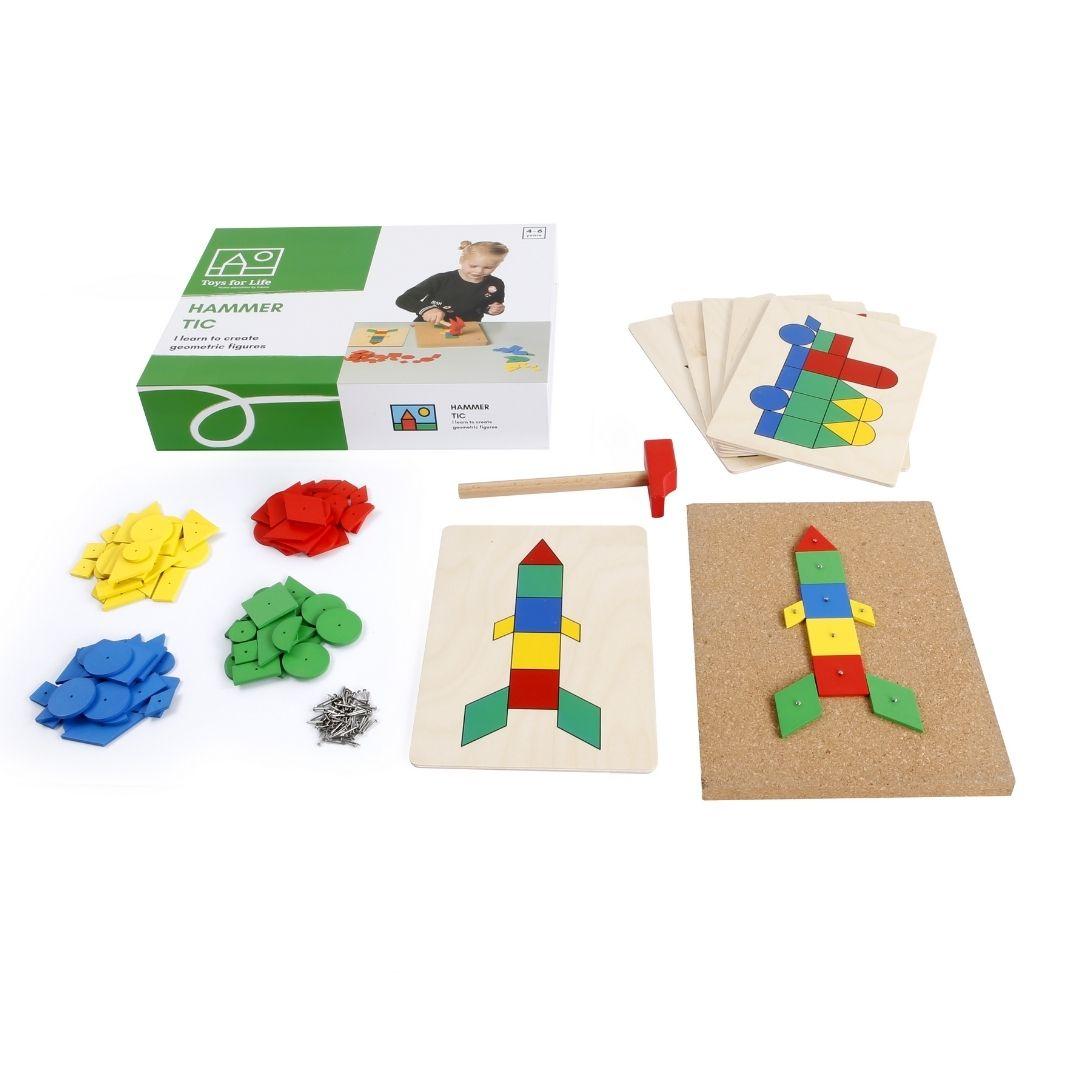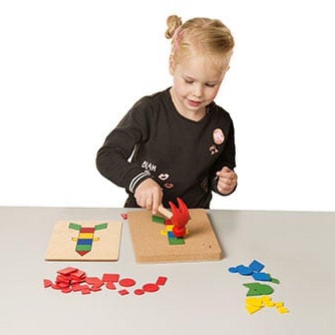 - Vključuje 1 plutasto podlago (24 x 18 cm), 108 lesenih delov v 4 barvah in 9 oblikah, 1 leseno kladivo in 108 žebljičkov ter 6 obojestranskih slikovnih predlog (21 x 15 cm). Pride v magnetni škatli (31 x 23 x 6 cm).